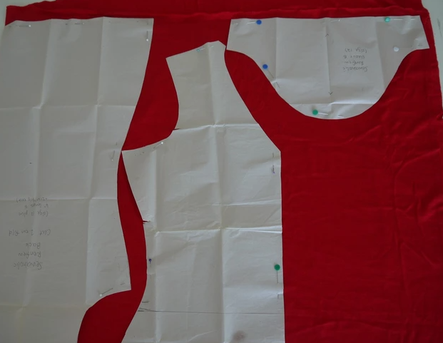 Положите все детали выкройки на ткань, поместив заднюю часть на складку. Передняя часть закончится центральным передним швом, поэтому вам нужно будет добавить припуск на шов - вы можете создать отдельный кусок выкройки, но я предпочитаю просто пометить его мелом.