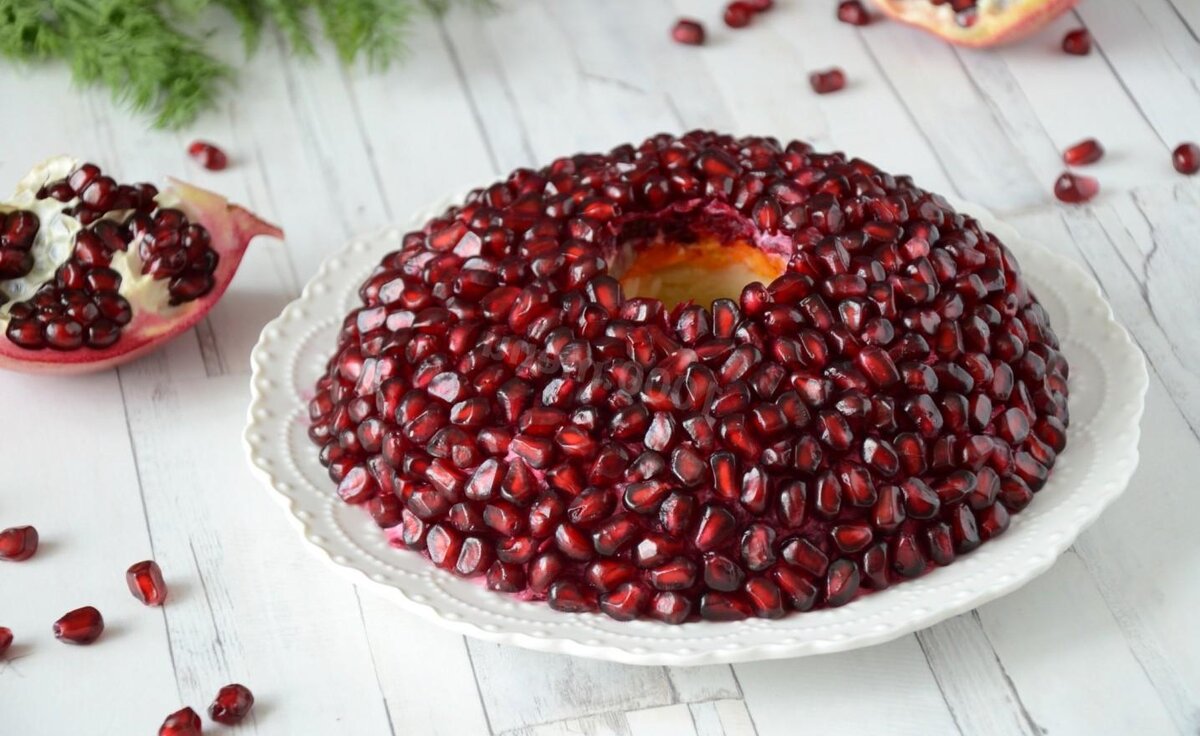 Далее убираем стакан и обмазываем заправкой внутреннюю часть салата, осторожно округляя края и добавляем зерна граната по всему "браслету"