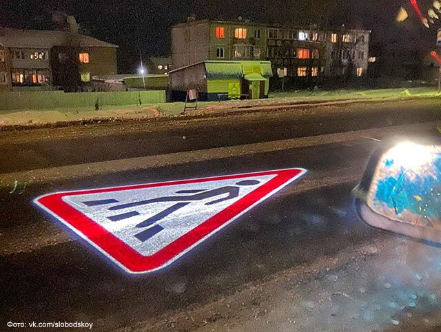 В деревне Стулово в Слободском районе водители заметили на дороге проекционный дорожный знак «Пешеходный переход». В темное время суток он виден издалека и должен предупредить водителей о необходимости снизить скорость. Знак проецируется на дорожное полотно с двух сторон с помощью специального устройства. Новая технология постепенно внедряется по всей России. Проекционные дорожные знаки и