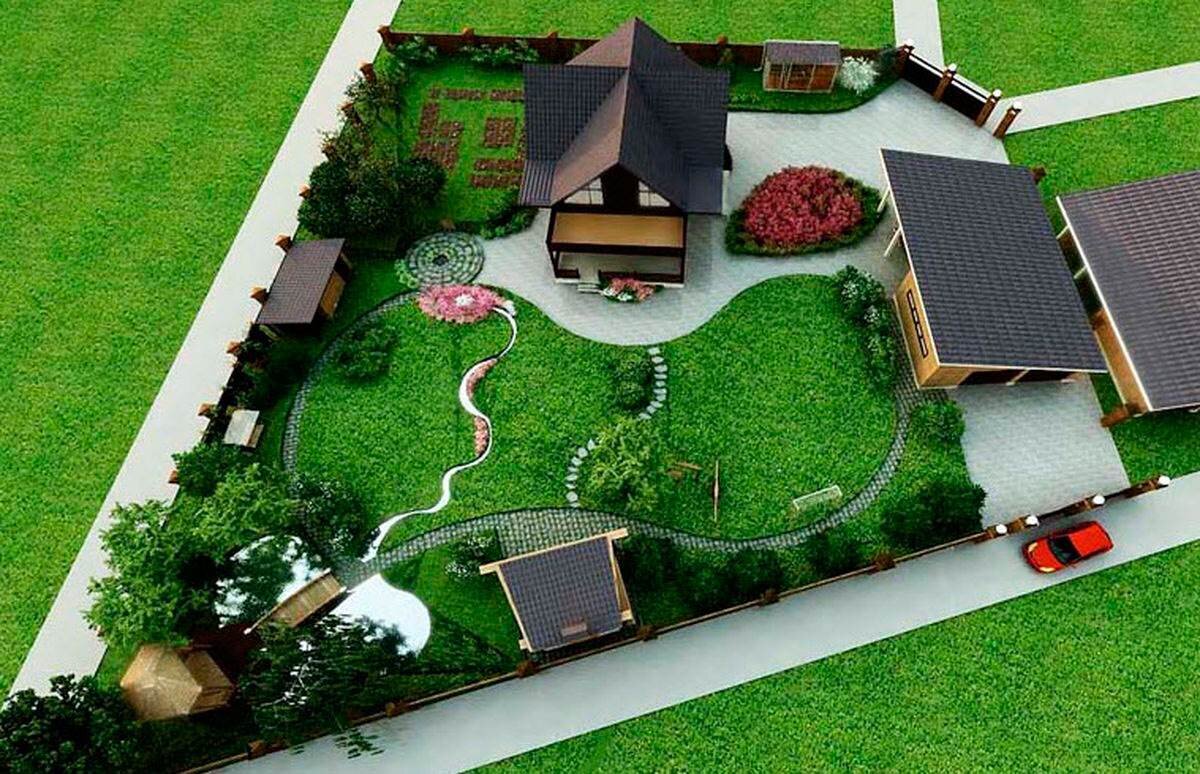 Несмотря на трудности, можно реализовать оригинальную планировку треугольного участка, которая будет и привлекательной, и функциональной.