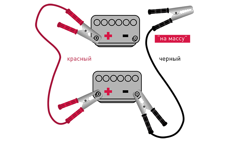 В итоге на заряженной АКБ провода одеты на две клеммы, плюс-плюс, минус-минус. А в автомобиле с разряженной батареей одета клемма «+», а «минус» брошен на «массу» двигателя.