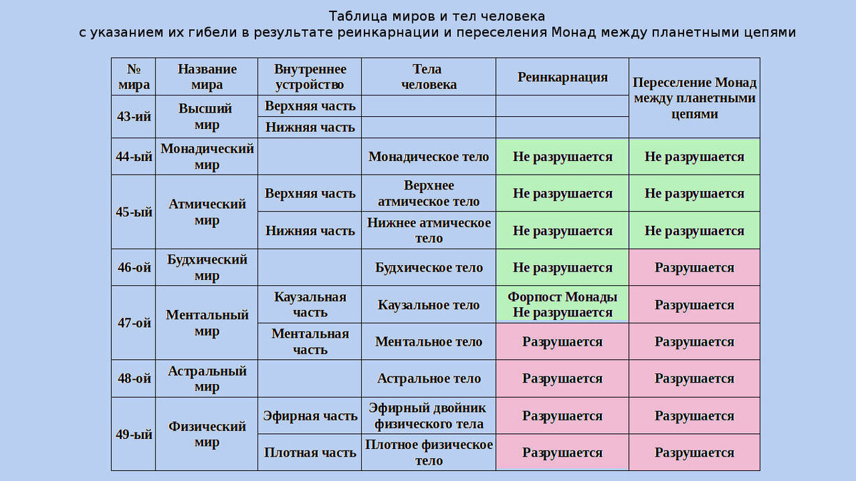 Получается что Западная религия не права? Это смотря с какой точки зрения посмотреть, если во главу угла поставить реинкарнацию человека, тогда все тела разделятся на две группы: 1) подверженные разрушению, 2) не разрушающиеся - «бессмертные», профессионалы используют более точный термин «условно бессмертные». В первую группу постепенно разрушающихся тел входят следующие: ментальное, астральное, эфирное и плотное физическое. Во вторую группу тел входят следующие: каузальное, будхическое, верхнее и нижнее атмические, монадическое тело. Первым телом не подверженном разрушению в результате реинкарнации является каузальное тело человека, именно оно является временным форпостом Монады для обыкновенного человека и в Теософии является полным эквивалентом Христианского термина «Душа». С этой точки зрения, Западная религия полностью права, «Душа — каузальное тело человека» не подвержено гибели в результате реинкарнации и сохраняет в себе все достижения прошедших жизней.