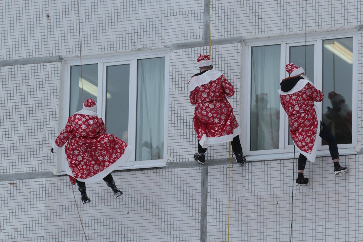 В этом году участниками акции стали 10 альпинистов, которые, надев красные шубы, шапки и бороды, спускались по стенам больницы, приводя детей в неописуемый восторг. Сами альпинисты говорят, что для них это стало уже традицией.