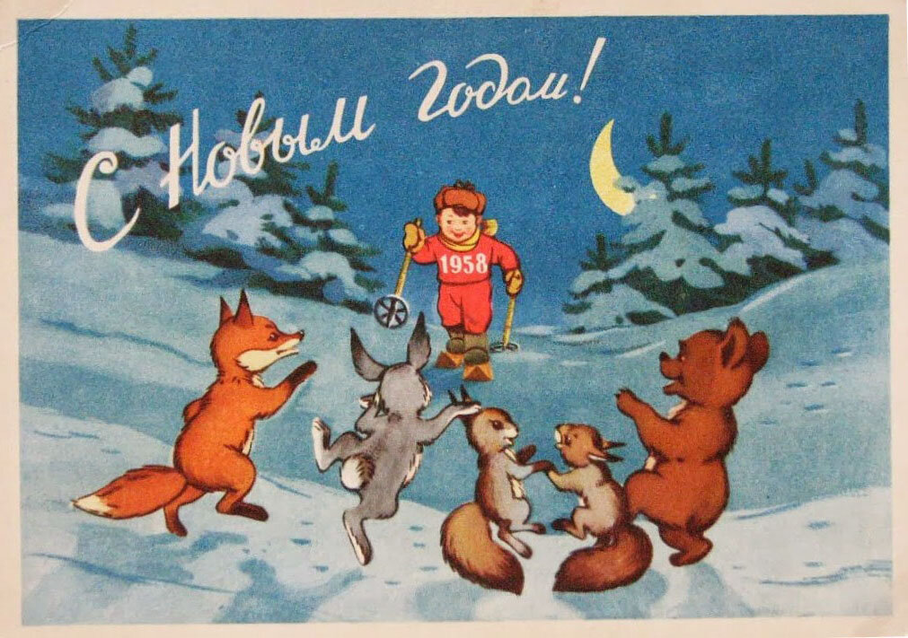 Полную реабилитацию новогодняя открытка получила в период оттепели, в 1953 году, когда вышел соответствующий приказ. Вернулись добрые Дед Мороз и Снегурочка, стали изображаться кремлёвские куранты, лесные зверюшки, снеговики. Эти, любимые с детства образы создавали замечательные советские художники: Каневский, Зарубин, Четверяков.