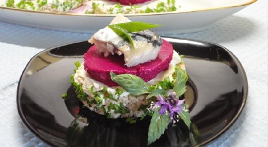 Любимый дуэт — свекла и сельдь в интересной подаче. Мне кажется, для праздничного стола стоит постараться. Количество ингредиентов указано условно. Все зависит от того, какой толщины слой мусса будет у вас застывать, и как вы будете его нарезать потом — прямоугольниками или кружочками. Первый вариант более экономичный. Меньше обрезков . Зеленое обрамление, думаю, возможно и из укропа. Он тоже хорош в этой компании. Одним словом, есть идея — творите!