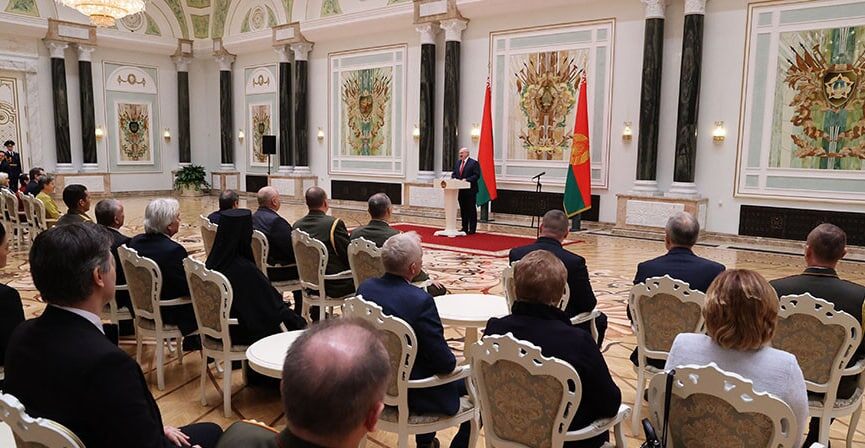 Лукашенко: "Новый год традиционно связан с надеждами на будущее, ожиданиями чудес и подарков. Даже мы, взрослые, ждем чудес. Высокие заслуженные награды и почетные звания - тоже подарок вам, вашим трудовым коллективам, родным. Знак признания заслуг перед государством".