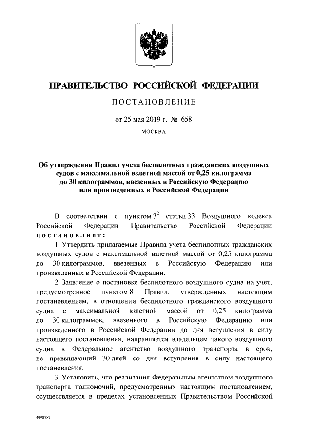 Как известно, с мая 2019 года правительство РФ утвердило Постановление №658, которое установило правила регистрации дронов. По которому с 27 сентября 2019 года беспилотники нужно регистрировать в Росавиации. А если точнее, все дроны, которые весят от 250 г до 30 кг.