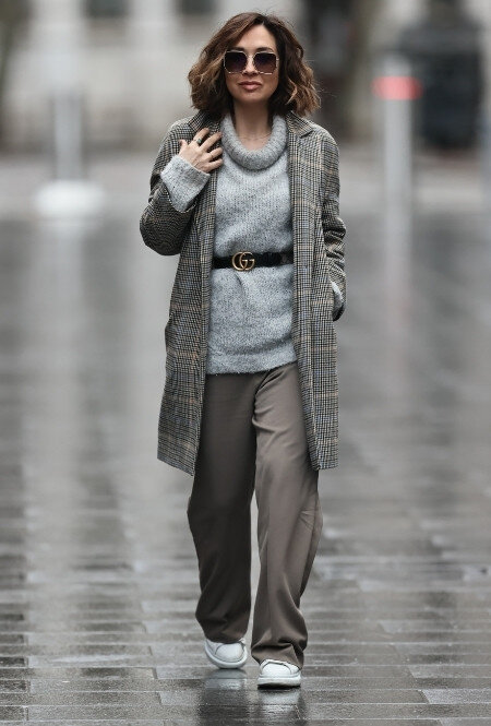 Зимой стильной альтернативой черно-белой палитре становится гамма серых оттенков, которые особенно уютно смотрятся на шерстяных и трикотажных тканях. Майлин Класс предпочитает сочетать разные вариации серого в одном тотал-луке — так они лучше подчеркивают друг друга и создают законченный аутфит, подходящий для любого жизненного случая. Телеведущая также добавляет в него светло-бежевый и белый