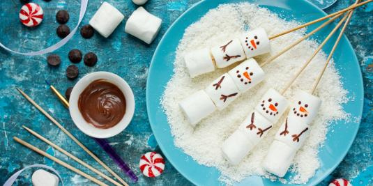 Берём три «рафаэлки» или крупных маршмеллоу, нанизываем на шпажки (подойдут обычные зубочистки) и «рисуем» лица снеговикам кусочками мастики или любыми съедобными красителями.