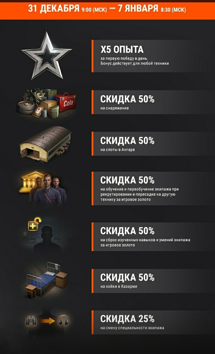 - Скидка 50% на сброс изученных навыков и умений экипажа за игровое золото.