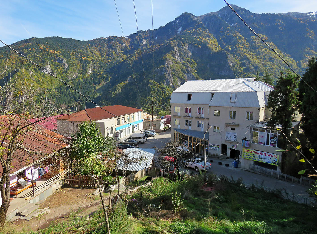 Дома и улицы Хуло, самого дальнего райцентра Аджарии, на фоне островерхой горы Аргети (1944м) буквально висят над бездной: