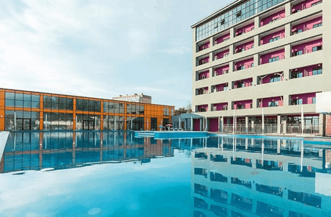 баня римская - терма: (лакониум) в здании отеля (1 этаж, бесплатно), баня русская, сауна финская: в здании отеля (1 этаж, бесплатно), хамам (1 этаж, бесплатно), #крытый подогреваемый бассейн с пресной водой (пользование бассейном входит в стоимость), #открытый бассейн с пресной водой 850 кв.м. (время работы: с 06:00 до 22:00, сезонно), горки, детское отделение в бассейне для взрослых, открытая охраняемая платная парковка, #СПА-центр, экскурсионное бюро.