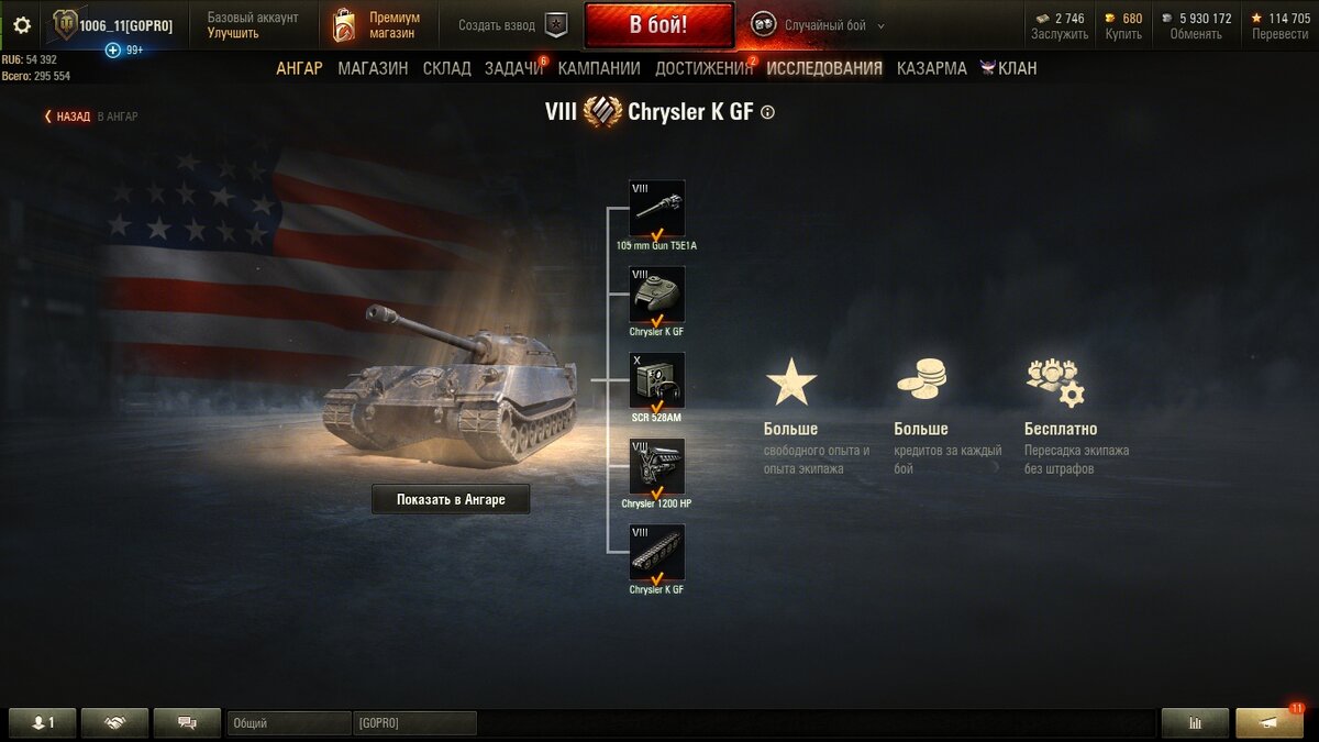 Пару дней назад я приобрёл себе Chresler K GF за 8000 тысяч бон, и сейчас я поделюсь с вами своим мнением по поводу данной машины, и скажу стоит ли её брать или нет! Начинаем! Chresler K GF Сам танк очень даже не плох я бы сказал даже хорош, но у него есть такие минусы которые не дают машине раскрыть свой потенциал. Сейчас вы сами всё поймёте. Огневая мощь Танк имеет разовый урон в 320 единиц прочности с перезарядкой в 9,68 с. (Это без оборудования и умений экипажа), время сведения 1,82 с., разброс на 100 м. 0,35 А теперь про дефект этого орудия. У него 198 мм. бронепробитие и это тот самый минус который не даёт много зарабатывать серебра на этом танке (Конечно есть премиум машины в которых бронепробитие 180 мм но мы сейчас говорим чего не хватает именно этому танку) Живучесть Бронирование башни просто отличное 254 мм, а броня корпуса 152 мм этого хватит чтобы сдержать выстрел из орудия с бронепробитием до 240 мм, если выше 240 то мы гарантировано получим урон. Мобильность С мобил