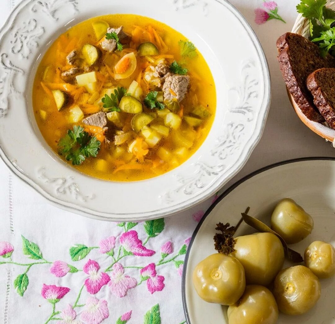 Рассольник – это такой суп из русской кухни, который по вкусу и ценности равен украинскому борщу и грузинскому харчо. Но обязательным ингредиентом являются соленые огурцы или помидоры – отсюда и название супа. Они, кстати, не обязательно должны быть солеными, не менее вкусным получится суп с маринованными и консервированными овощами. А сегодня мы мы будем готовить рассольник с солеными помидорами. При слове «рассольник» возникает ассоциации с блюдом в зеленом цвете. Но с помидорами такой суп может быть и красным – в зависимости от цвета использованных соленых томатов. Можно также приготовить двухцветный рассольник – с помидорами и огурцами. Очень вкусный пикантный суп. Рецепт обычный, но для этого рецепта лучше всего взять зеленые помидоры. Ингредиенты: Приготовление: Приятного аппетита! Радуйте и удивляйте своих любимых мужчин! Ведь пусть к сердцу мужчины лежит через желудок, как когда говорили наши бабушки!!!