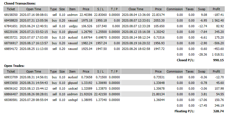 Здесь все закрытые c начала августа сделки и открытые позиции. На странице STRATT-NA обновил отчёты и открытые позиции. Напомню, что золото, как проверенный профитный инструмент, я всегда выделяю на счетах удвоенным лотом, и в итогах месяца буду давать комментарии по нему в конце поста.