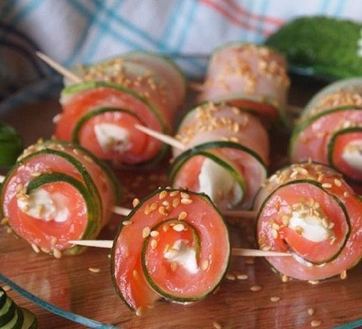 Ингредиенты: Огурец (большой) — 1 шт Форель (слабосоленая) — 150 г Сыр сливочный — 50 г Кунжут (белый) — 2 ч. л.