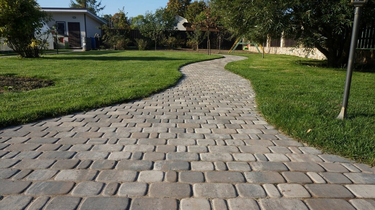 Мощеные дорожки на участке прекрасно гармонируют с кирпичными кладками. Становятся изюминкой ландшафтного дизайна в оформлении главной подъездной дороги.