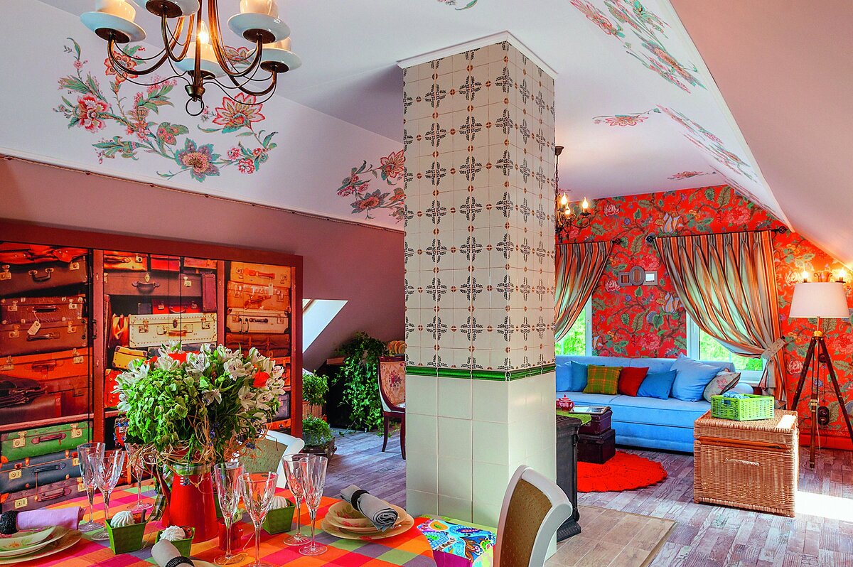 Почти по центру мансарды проходит труба дымохода. Для ее преображения выбрали два вида плитки: белую керамическую и майолику с растительным орнаментом. Разделили их полосой бордюра изумрудного цвета. На пол вокруг дымохода уложили небольшой квадрат из бежевой керамической плитки. У дымохода установили печь-камин. Она современная, но похожа на буржуйку. По периметру комнаты установили теплый плинтус.
