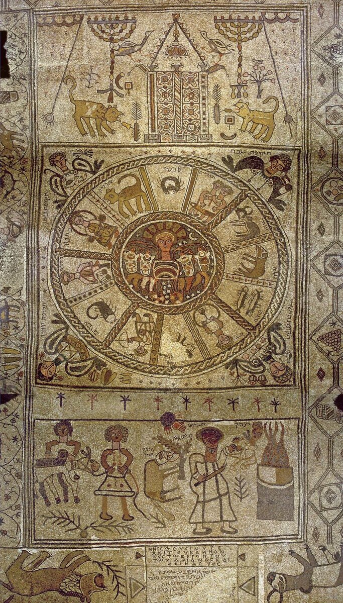 Центральная часть мозаики – это двенадцать знаков Зодиака, расположенных вокруг круга, в котором изображён Восход Солнца (Гелиос на колеснице). Исходя из этого ученые делают вывод: эллинизация пропитывала все, даже синогагольное творчество.