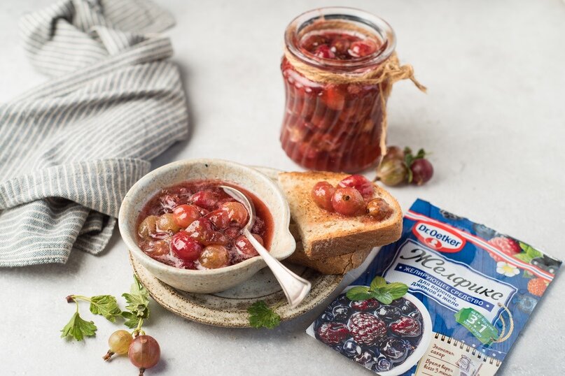 • Крыжовник свежий - 1 кг• Желфикс 3:1 - 1 упаковка• Сахар - 350 г• Вода - 50 г
