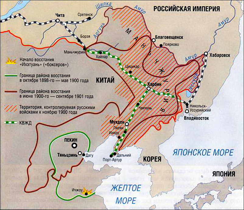 В самом конце XIX века Транссиб ещё не был построен в промежутке между Сретенском и Хабаровском. Один мост через Амур отнял бы несколько лет. Меж тем, существовал более короткий и простой путь по территории Китая. Он отмечен зелёным цветом, к тому же позволял связать железной дорогой Россию с Порт-Артуром, незамерзающей в отличие от Владивостока гаванью.