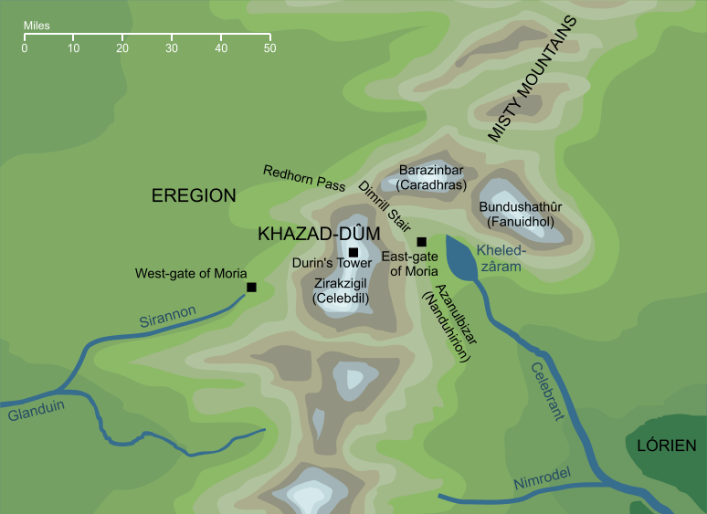 Мо́риа или Кха́зад-ду́м – огромный подземный город-государство гномов, расположенный в Мглистых горах под тремя пиками – Келебдилем, Карадрасом и Фануидолом. Там гномы соорудили обширную сеть подгорных туннелей, включавшую богатые чертоги и глубокие шахты, соединённые переходами. В течение многих тысяч лет с момента своего основания в Древние Дни Мориа служила обиталищем для клана Долгобородов, но после пробуждения балрога, убившего короля Дурина VI, она была заброшена и разорена орками Мглистых гор, надолго став местом тьмы и ужаса. История Кха́зад-ду́м был основан Дурином I в начале Первой Эпохи. Изначально Дурин жил под горой Гундабад на севере Мглистых гор. Путешествуя на юг, он достиг высокогорного озера, где он увидел отражение звёзд в воде в виде короны, сверкающей над его головой. Приняв это как благоприятный признак, Дурин впоследствии сделал это место своим новым домом. Он назвал это озеро Зеркальное или Келед Зарам, и оно оставалось почитаемым местом среди гномов, и постро