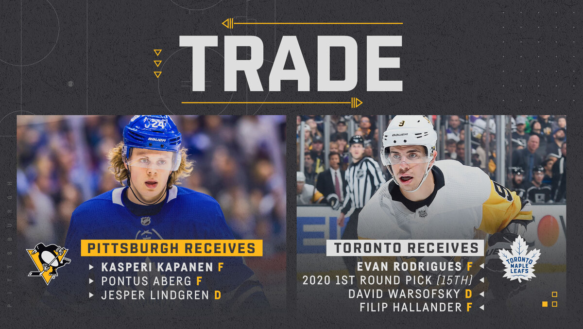«Пингвины» и «Мэйпл Лифс» вылетели из плей-офф Кубка Стэнли от «Монреаль Канадиенс» и «Коламбус Блю Джекетс» соответственно, поэтому обе команды пока плей-офф в самом разгаре уже готовятся к следующему сезону 2020-21. Во вторник обе франшизы были вовлечены в большой обмен, которая не только позволила Каспери Капанену воссоединиться с командой и генеральным менеджером, который задрафтовал его в первом раунде в 2014 году в Питтсбурге, но и позволила «Кленовым листьям» открыть столь необходимое пространство для потолка зарплат. «Кленовые листья» отдали нападающего Каспери Капанена, центрфорварда Йеспер Линдгрена, а также права на вингера Понтуса Оберга, который летом подписал контракт с «Трактором». «Питтсбург» расстался с пиком первого раунда драфта-2020 (15-й номер), форвардом Эваном Родригесом, талантливым проспектом Филипом Холландером и защитником Дэвидом Варсофски. Давайте разберем поподробнее на эту сделку с обеих сторон. «Торонто Мэйпл Лифс» оценка: 4 Очень трудно оценить на да