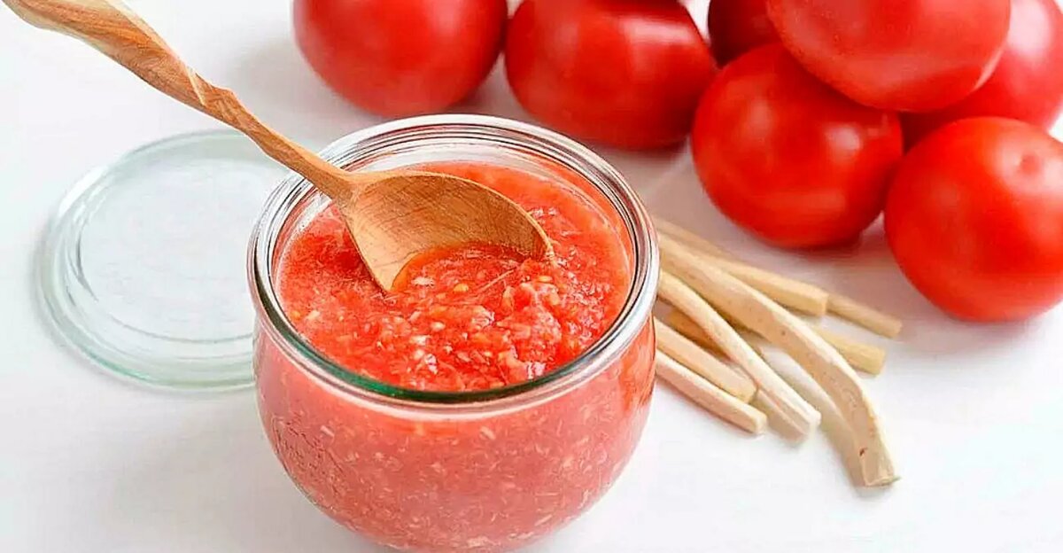 Для большей остроты ощущений можно добавить стручок красного жгучего перца. Томаты предпочтительно выбирать мясистые, чтобы приправа не получилась жидкой. А хрен желательно выкопать в октябре, когда витаминов в нем — наибольшая концентрация.