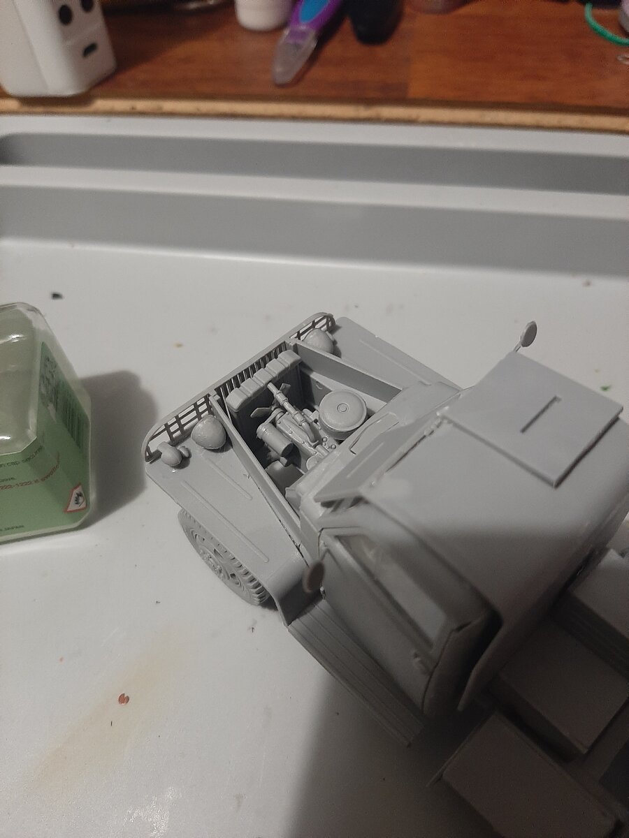 Всем привет, продолжаю сборку автомобиля "Катюша". Прикрепил фары. Надо было изначально установить фары, а уже после решетку капота. Не просто было обычным пинцетом (которым девушки выщипывают брови) установить их. Ибо они постоянно выскакивали. Надо купить нормальные пинцеты.