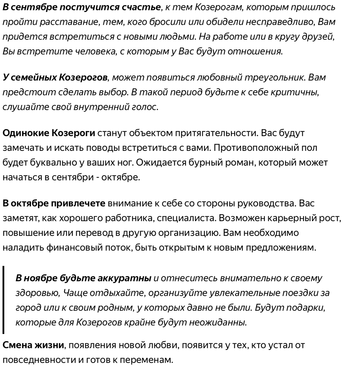 Козероги очень давно ждали перемен и вот сегодня я расскажу о том, что случится в ближайшие месяцы. Отмечу сразу, что вам можно позабыть о невзгодах и трудностях, которые преследовали вас, ведь теперь начнется совсем другое время. Ваш знак со 2 сентября выходит из оппозиции к сатурну и открывается влияние дружественных планет. Редкое событие буквально ураганом сменит ваш текущий уклад жизни и