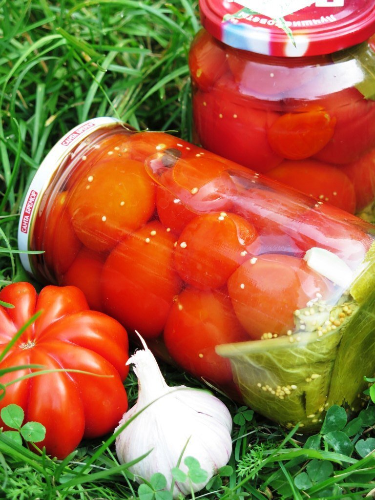 4. Chop the garlic finely and add to the tomato-filled jars. After that, pour the boiled brine into them. Cover tightly, turn over, wrap with a warm blanket and leave to cool completely. Then store in a cool place.