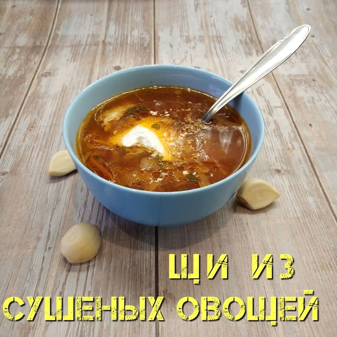 Сварить бульон. Разобрать и порезать мясо. В кипящий бульон добавить сушеные овощи, специи, соль. Варить до готовности капусты. При желании можно добавить томатную пасту для вкуса и цвета. Дать настояться 20-30 минут.