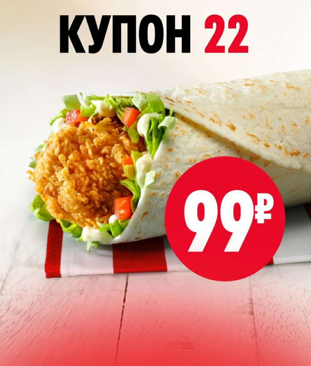 До 6 сентября в KFC Твистер можно взять за 99р Купон 22