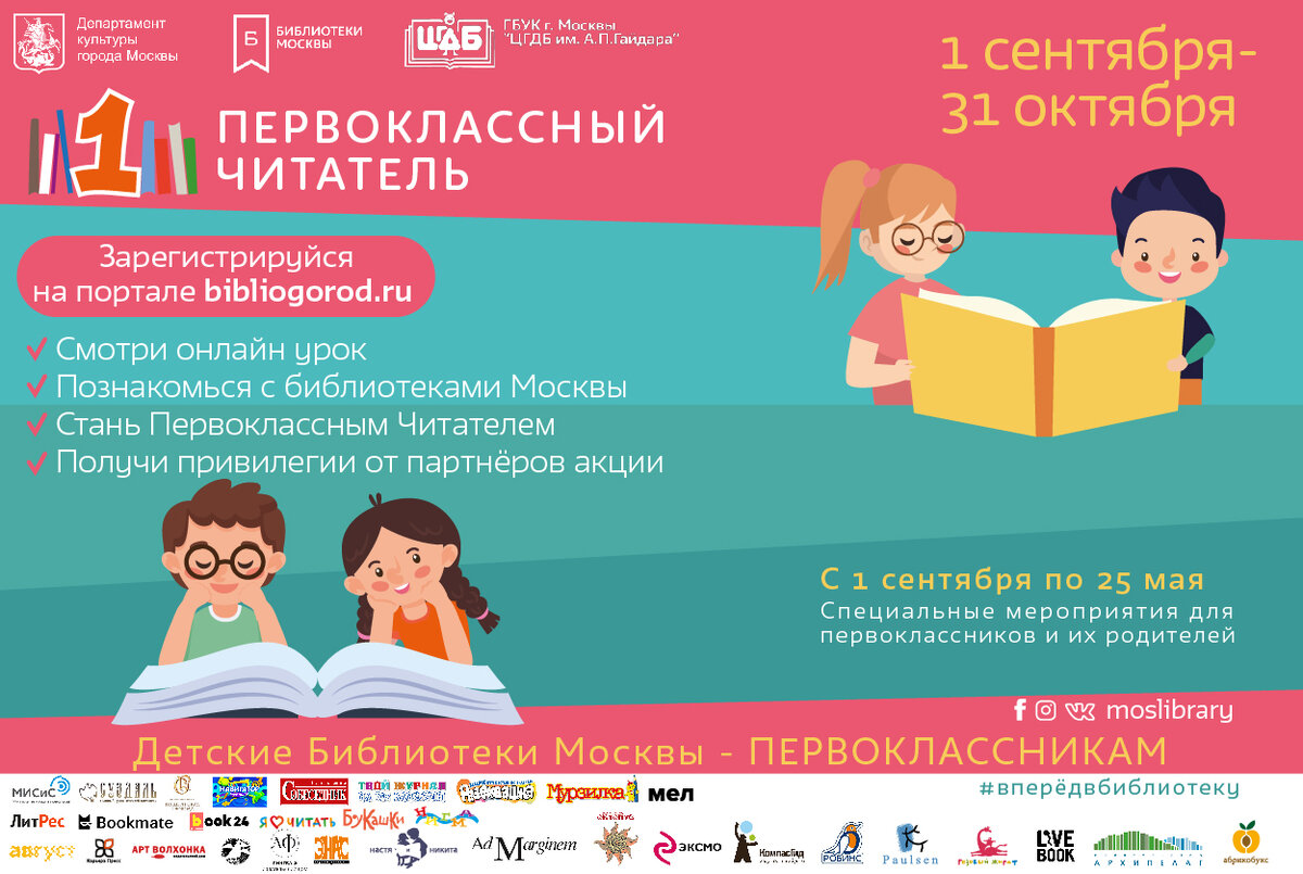 Ежегодная городская акция знакомства первоклассников с детскими библиотеками традиционно проходит в начале учебного года под названием «Первоклассный читатель». В прошлом году в ней принимало участие более 15 000 детей из 487 первых классов из 208 школ столицы. 2020 год не станет исключением, однако для обеспечения эпидемиологической безопасности детей, акция планируется к проведению в формате семейного онлайн-урока. Доступ к его просмотру будет открыт с 1 сентября по 31 октября после регистрации на портале Онлайн.Библиогород. Все зарегистрировавшиеся участники получат привилегии от партнёров акции. Семейный урок состоит из нескольких частей. В первой части урока ребят ждет мультфильм «Зачем ходить в библиотеки», видео поздравление с Днем знаний от детских писателей, среди которых Хельга Патаки и Наталья Волкова. Ведущие ученые и молодые исследователи: доктор технических наук, профессор Александр Громов и научный сотрудник Центра композиционных материалов, кандидат физико-математическ