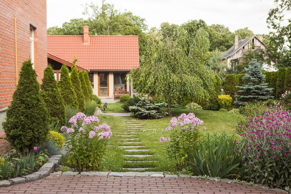 Основной идеей было создать сад, который бы выглядел привлекательно круглый год, — смиксовать хвойные и цветущие растения, однолетники и многолетники. Площадь участка — восемь соток, это позволило высадить высокорастущие деревья. Помимо хвойных (ели, сосны и туи), здесь поселили березу и бук. У входа гостей встречает бобовник, или «золотой дождь», который радует весной яркими желтыми гроздьями цветов. Ель Коника служит одной из акцентных точек. Зону посадок от дорожек отделяют вечнозеленые самшиты.