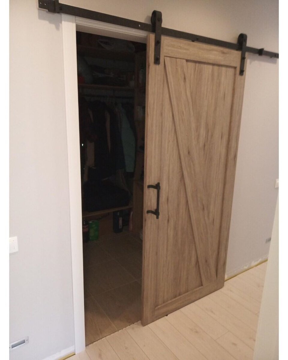 Раздвижные двери лофт- это двери в скандинавском стиле- дверное полотно выглядит как амбарная, сарайная дверь и сверху железный, брутальный механизм, который вешается на дверное полотно. В этом видео я расскажу о технических тонкостях амбарных дверей лофт, также отвечу на частые вопросы, которые задают нам покупатели таких дверей. Основой раздвижных амбарных дверей является барный механизм, разверной механизм открытого типа состоящих из рельсы и двух каретах с роликами. Рельса представляет из себя- обычную, железную пластинку длиной 2 метра и крепится к стене с помощью втулок на расстоянии 33 миллиметра, здесь сразу отмечу один минус, что это расстояние не регулируется/ Второй момент- это каретки амбарных дверей и их ролики, благодаря такому укреплению, что обычно у раздвижных дверей ролики крепятся на полотно сверху и поэтому конструкция полотна должна иметь сверху какое-то основание, то в данном случае можно хоть фанеру повесить эти каретки они могут быть разной формы, в данно