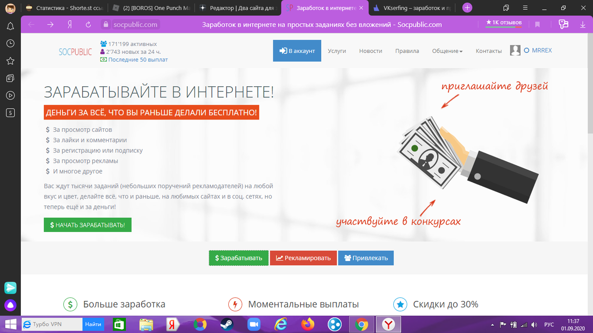 1.Socpublic Первый сайт socpublic, здесь можно заработать на выполнений заданий,серфинга,письма и.т.д Здесь можно на заданиях легко заработать, я заработал за день 50рублей Заданий здесь много, они начинаются от 0.2 до 200 рублей, от стоимости задание усложняется Вы можете выводить на qiwi,payeer,webmoney,банковскую карту,на телефон и.т.д здесь даже школьнику легко будет заработать, вы от рефералов получаете 50% с их заработка 2. VKserfing Второй сайт vkserfing здесь вы будете зарабатывать на соц.сетях там заданий много за день можно 100-150 рублей заработать Здесь есть вк,инстаграм,тик ток,лайк,телеграм, потом они еще ютуб и фейсбук добавять здесь вы просто подписываитесь, ставите лайки, комментарий пишите Еще вы можете свою группу,страницу тоже прорекламить вы получите 20% процентов от рефералов Здесь можно вывести на qiwi,payeer,webmoney,yandex money и на телефон Вывод здесь от 50рублей Пополнить вы можете с webmoney,qiwi,apple pay,yandex money,телефон,альфа банк,карты Потом я в