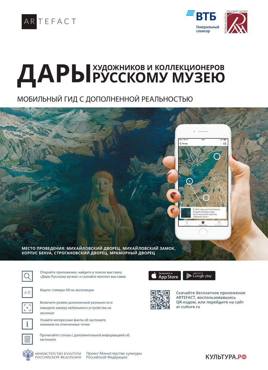 Русский музей при поддержке Банка ВТБ запускает виртуальный гид «Дары Русскому музею» – рассказ о 29 произведениях, подаренных музею с момента его основания и до наших дней. Гид, созданный в приложении дополненной реальности «Артефакт», доступен не только владельцам смартфонов, но и всем пользователям сети Интернет – на официальном сайте приложения.
