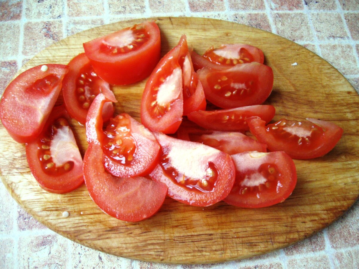 Взять крепкие зрелые мясистые помидоры и приготовить маринад: 1,5 литра воды, 2 ст. ложки соли без верха, 6 ст. ложек сахара, пряности - душистый перец, гвоздика, черный перец горошком, чеснок, мелкий лук, растительное масло, уксус.