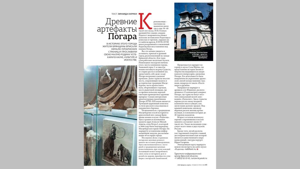 «Отдых в России» — журнал о внутреннем и въездном туризме. Рассказы о путешествиях, интервью с профессионалами туристической отрасли, фотографии уникальных мест. Теперь многие узнают и об уникальных местах Брянщины.