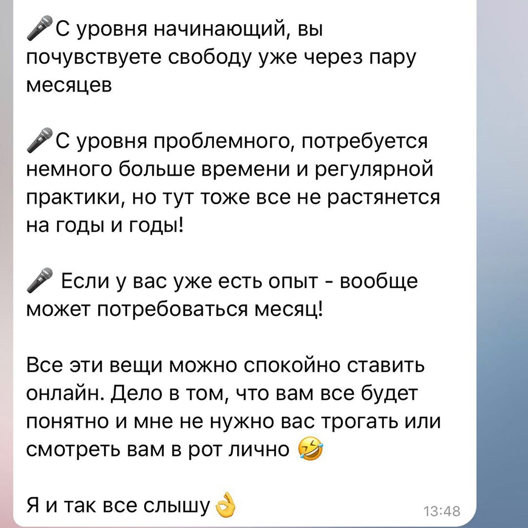 На этом этапе мне нужно узнать вас, ваши цели, мечты и уровень владения голосом на данный момент. Это важно, так как на этом этапе я формирую для вас личный план💯