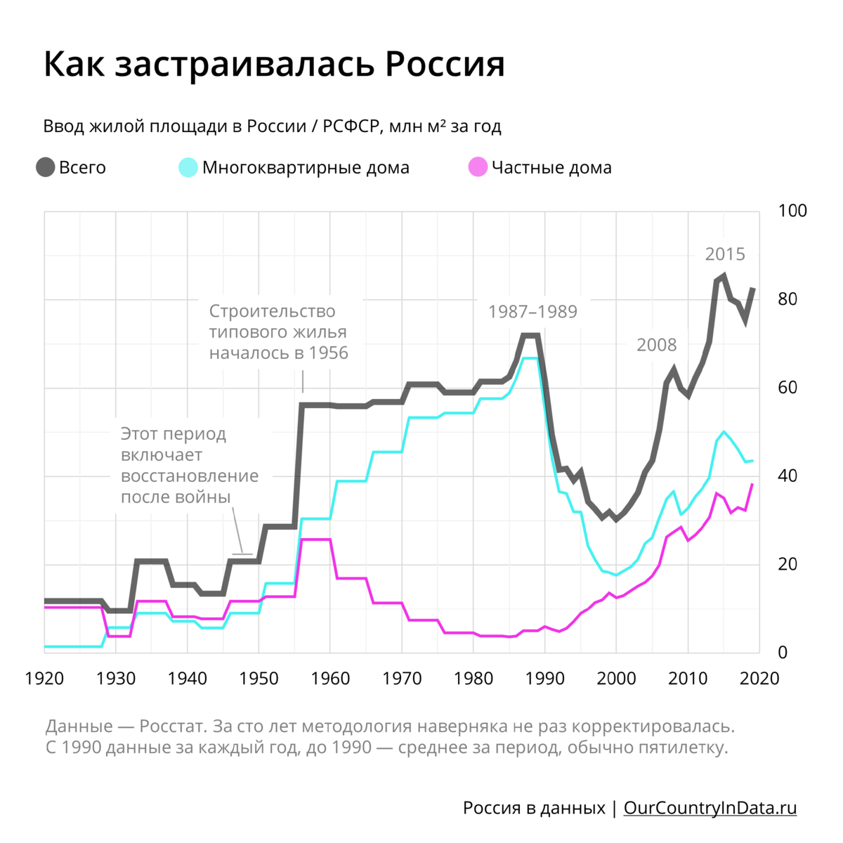 Таким образом, многоквартирных домов сейчас строят все-таки меньше, чем при советской власти. Но зато строят больше домов частных.