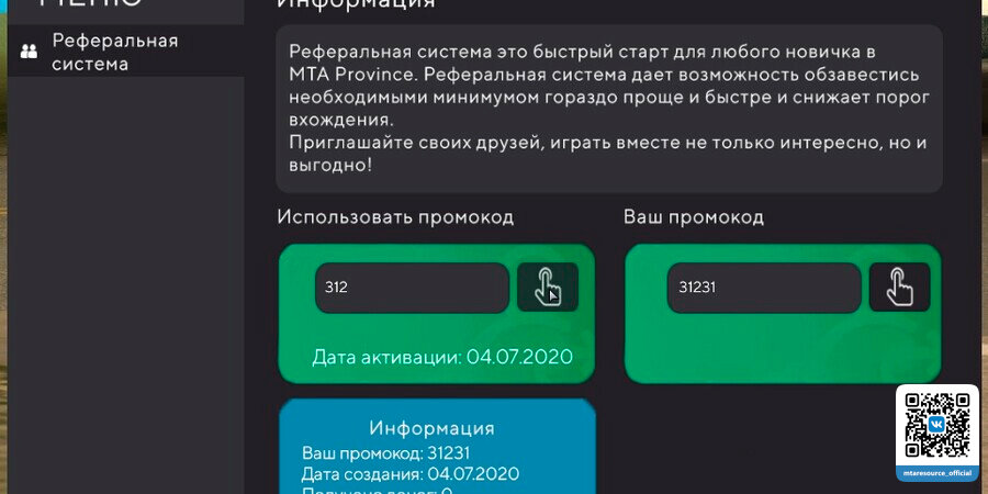 Система промокодов как на проекте MTA Province. Автор(ы): JST ProjectСкачать мод можно здесь: https://mtaresource.ru/resource?rid=450