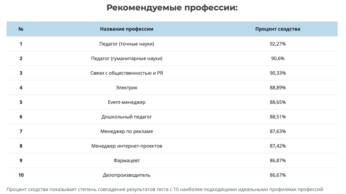 Я проходил несколько разных профориентационных тестов – платных и бесплатных. Это происходило на разных этапах жизни – и тогда, когда я был совсем не счастлив и реализован в работе и сейчас, когда моя работа – это самая лучшая реализация, которую я испытывал в жизни. Сейчас я коуч по развитию сильных сторон и корпоративный бизнес тренер.