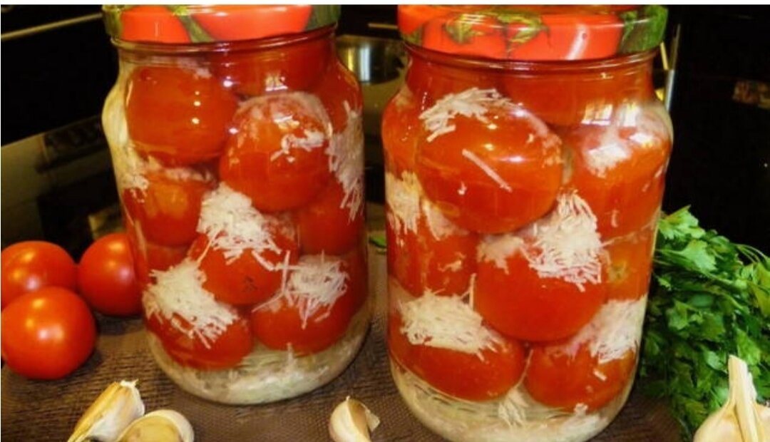 Когда увидела впервые такие помидоры на столе у своих друзей, то меня в первую очередь поразила их красота. Угощались мы ими зимой и было такое ощущение, будто их и правда припорошили при подаче снежком. Красное и белое – это два цвета, которые отлично гармонируют в дизайнерских решениях. Да и здесь это природное сочетание выглядит просто потрясающе! О вкусе можно также долго говорить, но все же так и не передать его очарования. Это все равно, что описывать вкус чего-то такого, что ты никогда не пробовал. Ну как такое опишешь?! Остается всегда говорить одно и тоже, а именно – избитое «очень вкусно». Вначале, поглядывая на закуску, мне казалось, что в ней используется хрен. Но попробовав стало понятно, что по вкусу на него не было похоже совсем. И конечно же, вариантов угадывания больше не оставалось, очевидно, что в качестве белого пушистого снежка выступает обычный чеснок. Лично я предпочитаю консервировать такую заготовку в литровые банки. Особенно это удобно для небольшой семьи. Открытая баночка получается для одного приема пищи. Откроешь такую к вареной картошечке, или к мясу, да и съешь сразу все без остатка. А для желающих есть еще и рассол, который также вкусен. У нас кстати, как правило все не только съедается, но и выпивается без остатка. Но делаю я несколько баночек и большего объема. В дело идут и 2-литровые, и 3-литровые. Их удобно консервировать к приходу гостей. И уже в зависимости от того, сколько человек ожидается к праздничному столу, можно открыть либо одну, либо другую.