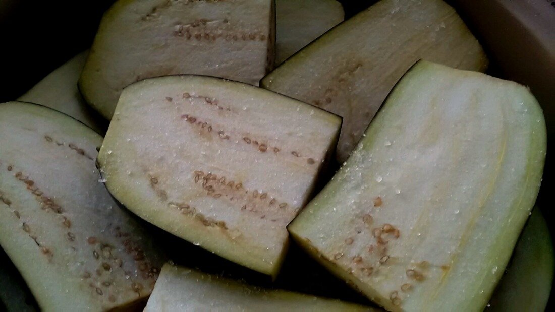 Баклажаны я разрезала на большие куски, сложила в форму, немного посолила, накрыла фольгой и отправила в духовку.