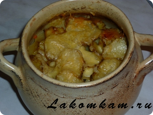 Блюдо из мяса «Печень по-волжски». Ингредиенты: печень — 150 грамм; картофель — 5 штук; лук репчатый — 1 штука; сыр твердый — 70 грамм: молоко — пол стакана; соль, перец.