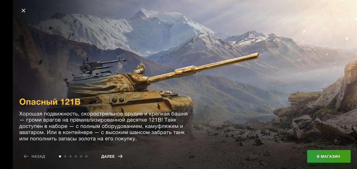 Здравствуйте, уважаемые читатели и подписчики канала ! Сегодня мы поговорим об одном замечательном танке, который сейчас находится в продаже. 121 B в золотом камуфляже. Он по праву заслуживает звание одного из самых красивых в игре. Танк нечастый гость, тем более за золото. Цена в 15000 золота за десятый уровень, учитывая к тому же, что танк довольно неплохой, демократичная. Да в придачу к танку идёт камуфляж, оборудование и сертификаты со слотом в ангаре. Доступен вариант сундуков, но здесь уже все зависит от вероятности. Покупать их стоит только в надежде получить дополнительно золото. Давайте посмотрим, чем же хорош 121 B. Танк довольно универсален, хорошо играет как в атаке, так и на позиции поддержки. Бронирование танка довольно хорошее, крепкая, рикошетная башня, рациональный угол наклона лобовой брони корпуса позволяют часто танковать и ловить непробития. Орудие имеет хорошую скорострельность, перезарядка около 6 секунд и альфа в 350 ед. пробитие такое же, как и большинства