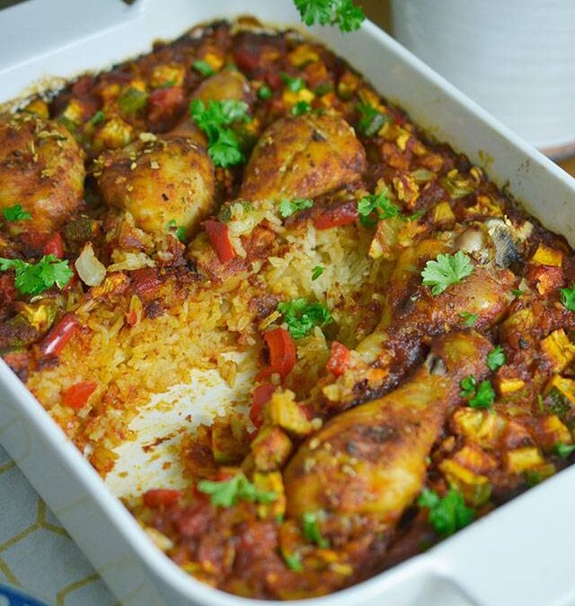Курица, запеченная в рисе с овощами - это блюдо, которое готовится в одном блюде. Все сырые ингредиенты выложить в жаростойкую форму, залить водой, томатной пастой и специями и поставить в духовку. Этот рецепт требует только от нас, чтобы заранее замариновать курицу, нарезать овощи и приготовить маринад - в общей сложности это займет не более 15 минут. А курицу нужно запекать в духовке около 1 часа 15 минут. Блюдо будет максимально эффектно, если вы подадите его к столу в том блюде, в котором оно запекалось, посыпав свежей зеленью, что придаст свежести и сделает курицу намного красивее. Курица, запеченная в рисе с овощами - блюдо, к которому вы вернетесь. Приятного аппетита! Количество порций: 6. Время приготовления: 2 часа. ИНГРЕДИЕНТЫ РЕЦЕПТ БЛЮДА 1. Посыпьте курицу с каждой стороны солью, сладким перцем, майораном и сушеными овощами (Вегета). Лук и чеснок нашинковать и выложить в блюдо с курицей, оставить на несколько часов, чтобы они попробовали. 2. Нарезать кубиками цукини