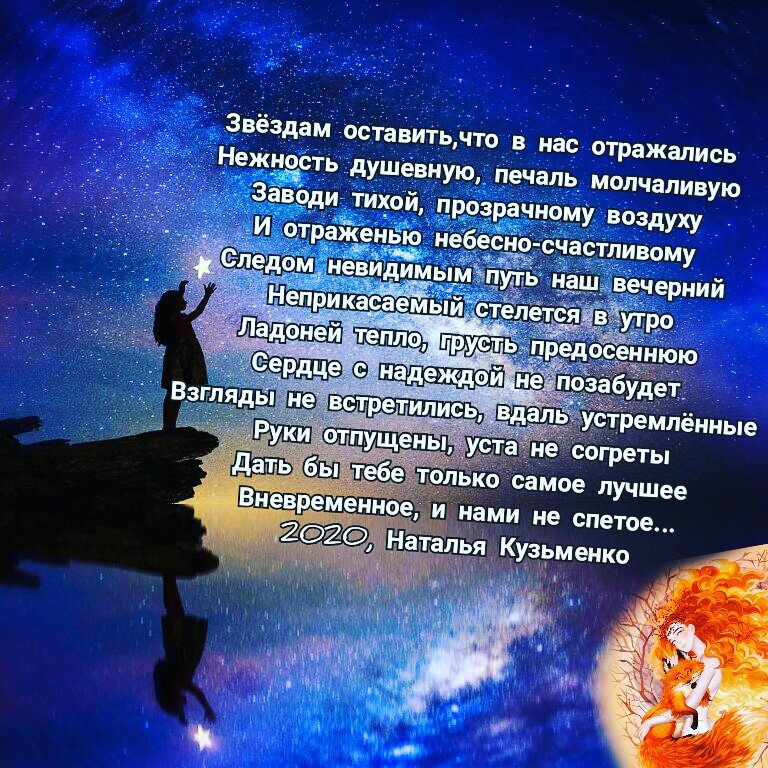 Звёздам оставить,что в нас отражались Нежность душевную, печаль молчаливую Заводи тихой, прозрачному воздуху И отраженью небесно-счастливому Следом невидимым путь наш вечерний Неприкасаемый стелется в утро Ладоней тепло, грусть предосеннюю Сердце с надеждой не позабудет Взгляды не встретились, вдаль устремлённые Руки отпущены, уста не согреты Дать бы тебе только самое лучшее Вневременное, и нами не спетое... 2020, Наталья Кузьменко